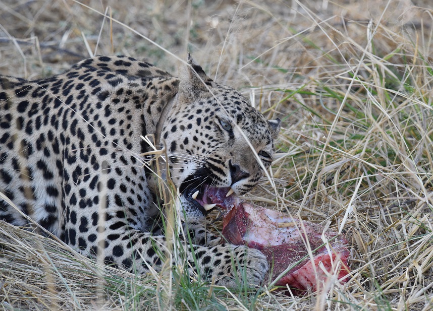 The first one was a small leopard eating a huge chunk of meat. The leopards are accustomed to the safari vehicles, but this one was a bit nervous and, to protect his meal, he went up into a nearby tree.